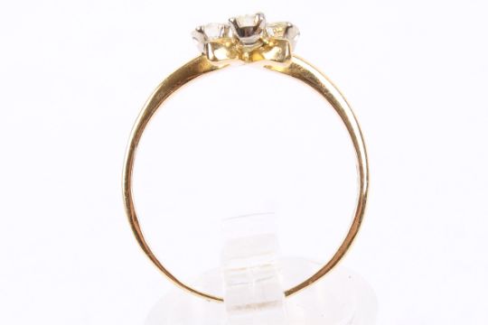 An 18ct gold three stone diamond ring. Set with three round brilliant cut diamonds of circa 0.30ct, in a hallmarked 18ct gold mount. Size R, gross weight 2.2g.