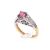 A 21ct red and white stone ring. With two panels of small white stones set in white metal leading to a central pinky-red square faceted stone. Unmarked. Size N/O, weight 5.5g.