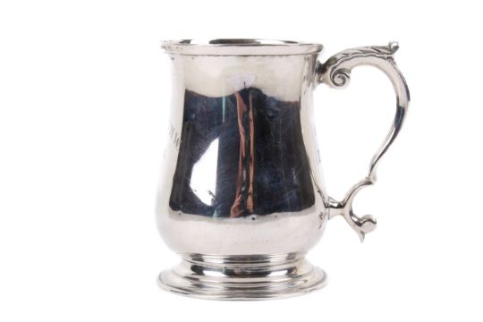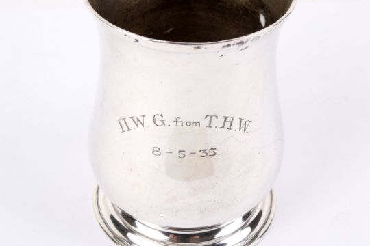 A 1930s silver christening mug. With folded lip rim, engraved dedication reading 'HWG from THW, 8-5-35), on a spread base, hallmarks for Stokes & Ireland Ltd, Chester 1934 with jubilee mark. H9.5cm, weight 185.7g.