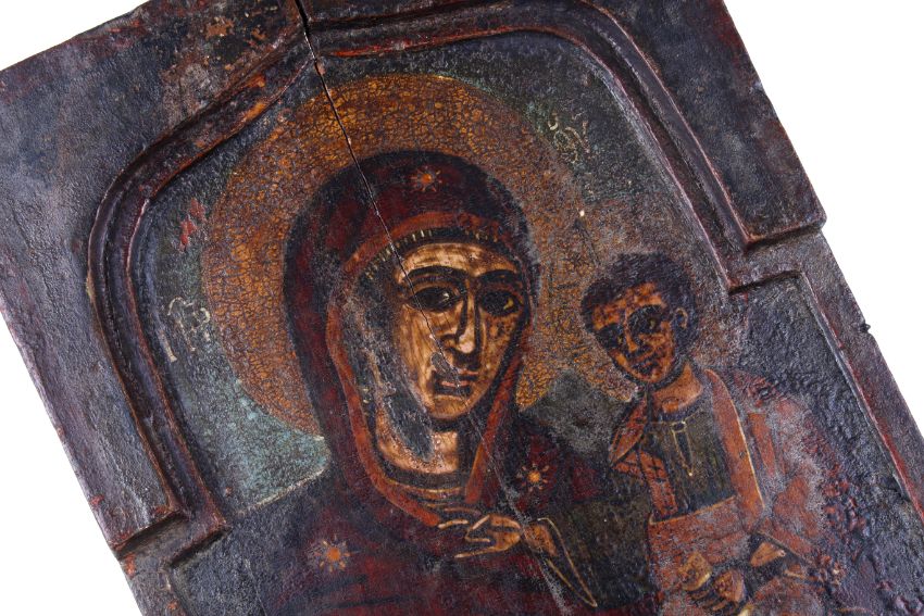 A 17th century or later Russian icon painting on wooden panel 'Madonna and Child'. 18cm x 32.5cm