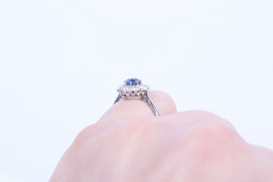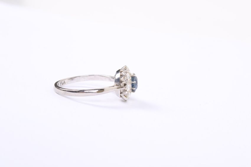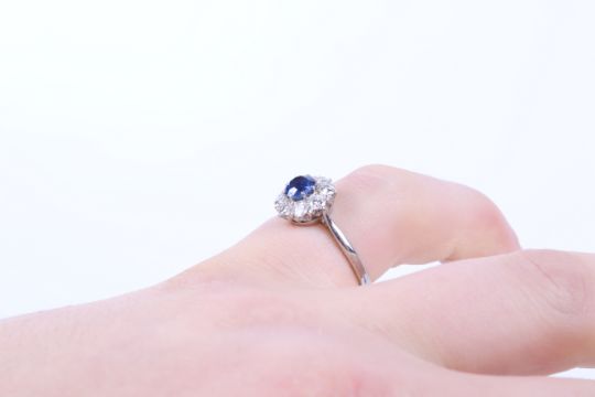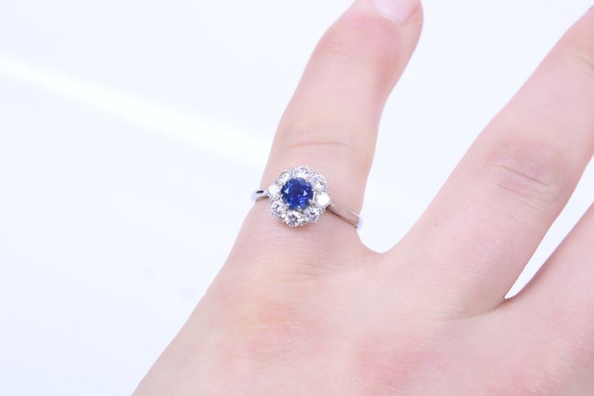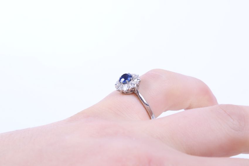 A diamond and sapphire cluster ring. With eight small times around the vivid blue stone, the shank marked 18ct PLA. Size O/P, weight 3.7g.