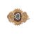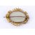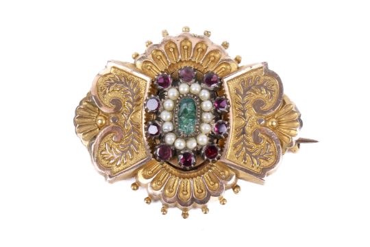 A late 19th century mourning brooch. The gilt repousse hollow brooch set with a green stone surrounded by a band of pearl beads and purplish garnets. A scrap of fine, pale green woven fabric set behind glass to the back. metal unmarked. 3cm x 3.5cm.