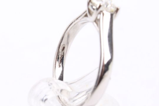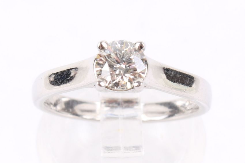 A platinum single diamond ring. Set with a round brilliant cut diamond of circa 0.54ct (0.54 stamped within the shank), in a hallmarked platinum mount. Size M, gross weight 4.7g.