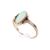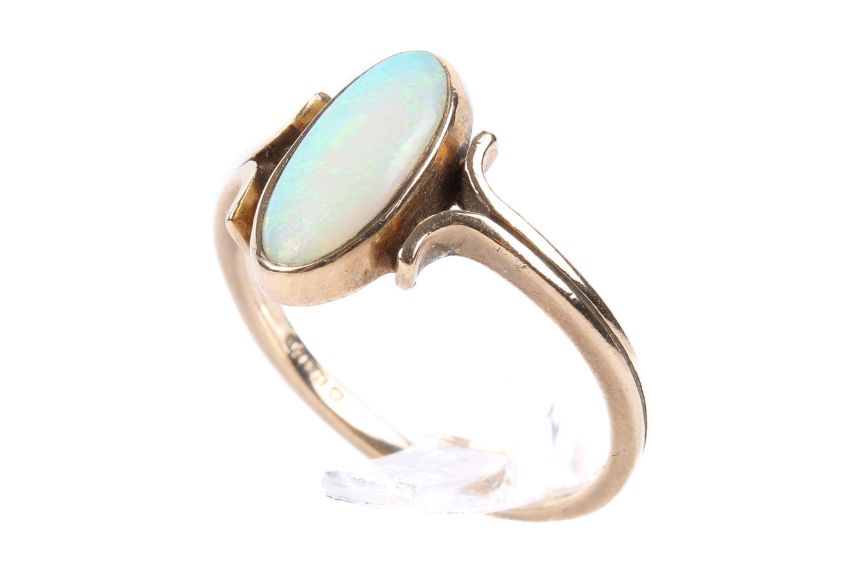 A 9ct gold and opal ring. The slender oval opal flanked by scrolls. With hallmarks, size M, weight 2g.