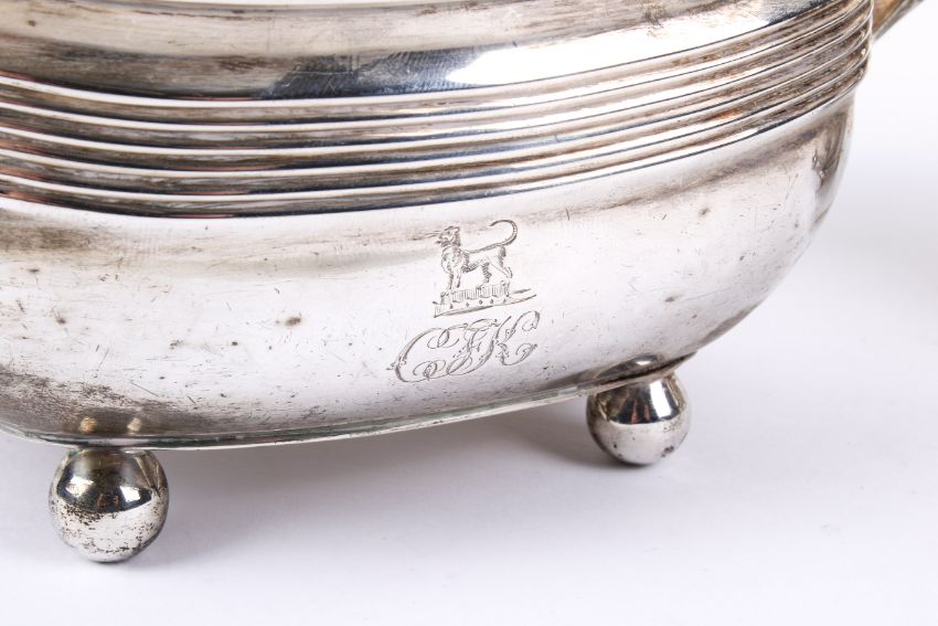 A Georgian silver sugar bowl and matching jug. Gilt to the inside, with square scroll handles, horizontal ribbing to the body, raised on bun feet, rubbed monogram beneath a dog to each, hallmarks for William Bennett, London 1807. Bowl H11.3cm, gross weight 482g.