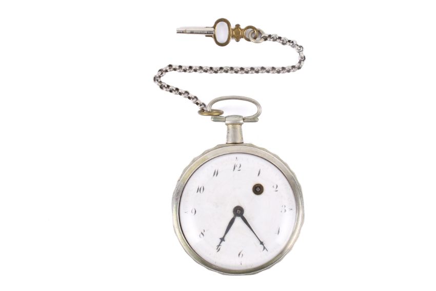 A 19th century Georgian open faced pocket watch with fusee movement. White enamel dial with Arabic numerals, key wind, blued hands, interesting silver pierced and engraved coat of arms cock plate. Diameter 55mm