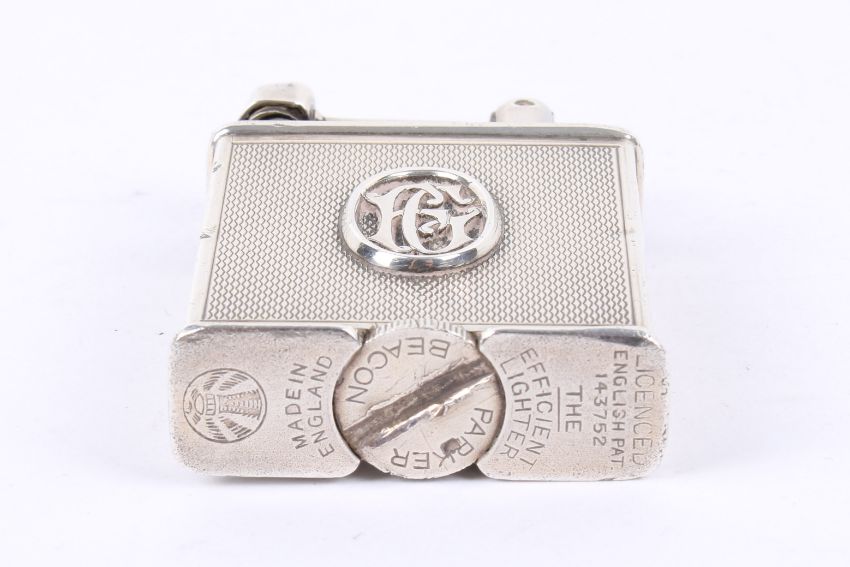 A Parker Beacon silver pocket lighter. With engine-turned panels and central oval monogram for FG. 'Efficient Lighter', patent no. 143752. Hallmarks for Parker Pipe Co, London 1932. H5.1cm, weight 55.3g.