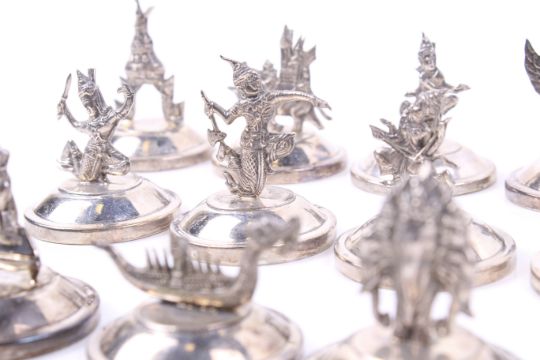 A set of twelve 'Siam Sterling' place markers. Each in the form of either a figure, an elephant, a boat or a pagoda, on a round base, the largest approx. 4cm high, the bases approx. 3.25cm diameter (1 1/2 x 1 1/4 inches), the bases possibly loaded, 631g