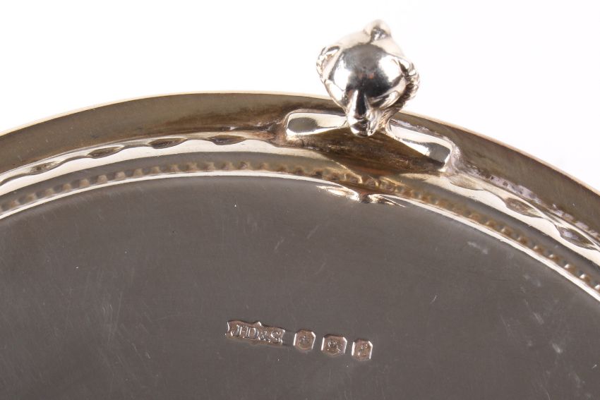 A small silver salver. With beaded borders over ball and claw feet. Hallmarks for James Dixon & Sons Ltd, Sheffield 1972. Diameter 15cm, weight 187g.