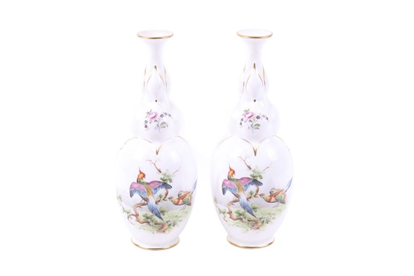 A pair of 1901 Royal Worcester shaped vases decorated with exotic birds. With double garlic shaped neck, decorated and gilt with two groups of birds between floral sprigs. Green mark to base and puce number 2. H21.5cm. (One with damage to lip rim).