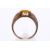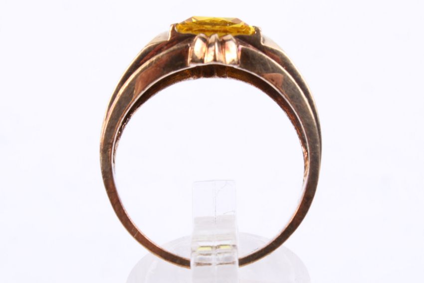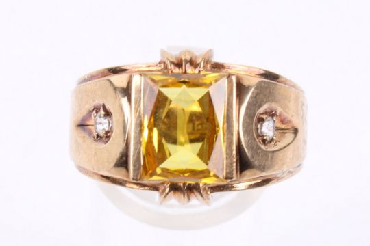 A gentleman's 10ct gold and citrine ring. The wide shoulders set with small inset white stones, the central yellow faceted stone of rectangular form, circa 10mm x 7.6mm. Marked 10K ... (illegible). Size U, weight 7.6g.