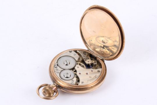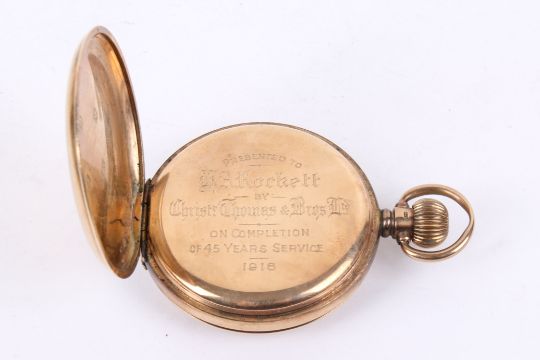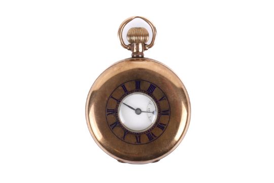 Hallmarked 9ct .375 gold half hunter pocket watch. Birmingham, 1915, white enamel dial Roman numerals, Swiss made 15 jewels movement, case stamped 'Dennison Watch Case Co.', presentation engraving inside. Case diameter 50mm. Gross 91g.