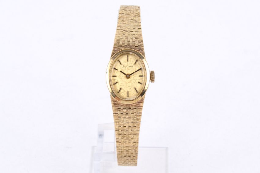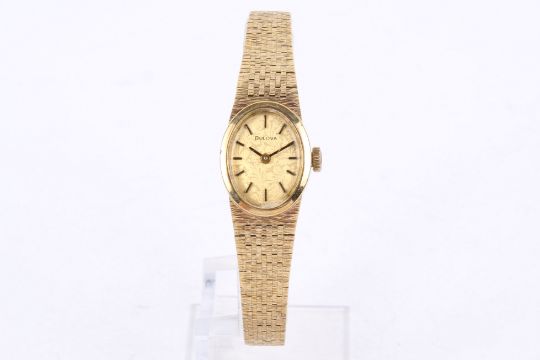 A lady's late twentieth century hallmarked 9ct gold Bulova dress watch. Oval dial with integral bracelet. Mechanical movement. Watch is running but timekeeping has not been tested. 22.9 grams gross weight.
