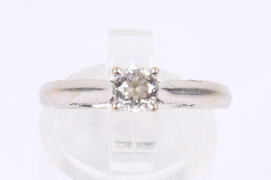 A diamond solitaire ring. The round modified brilliant cut diamond of 0.4ct, colour G, clarity I1, in an unmarked white metal mount, each side set with eight small diamonds, the band marked 'FOREVER', size M. With IGI report number F7A34792, with original 'The Forever Diamond' box.