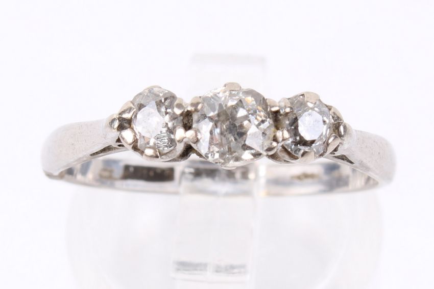 A white metal three stone diamond ring. Set with three old mine/old brilliant cut diamonds of estimated 0.65ct. Inner shank stamped 18ct plat. Size Q. Gross weight 3.4g.