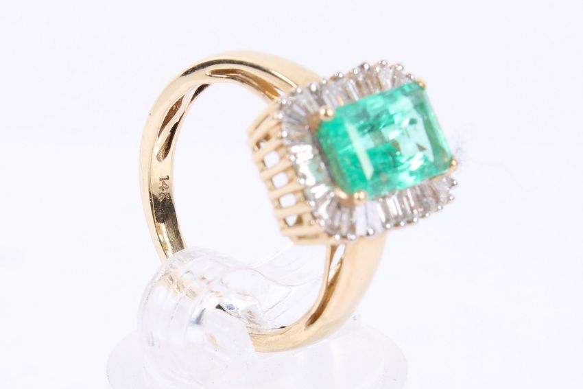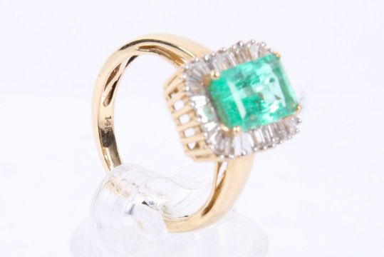 A yellow gold emerald and diamond cluster ring. The emerald cut emerald of 1.67 carats approximately, bordered by thirty one tapered baguette cut diamonds of 0.62 carats estimated total weight. Hallmarked 14ct gold mount.(Makers mark indicates originally an internet purchase) 3.5 grams gross weight.