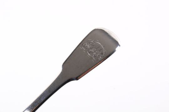 A Georgian silver fish slice. Pierced with a fish amongst acorn branches, monogram to the handle, hallmarks TD probably for Thomas Dicks, London 1827. L29.3cm, weight