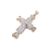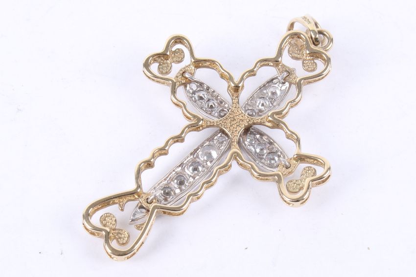A 9ct gold and white stone cross pendant. Of shaped form with inward scroll ends, set with graduated white stones, London hallmarks, 375, to suspension loop. H5.7cm x W3.9cm, weight 10g.