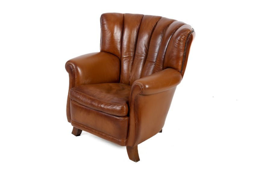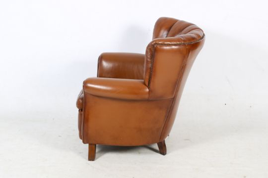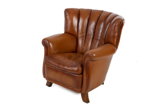 A contemporary Tetrad Ella leather armchair. With brass stud detail raised on wooden supports. H90cm