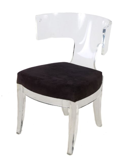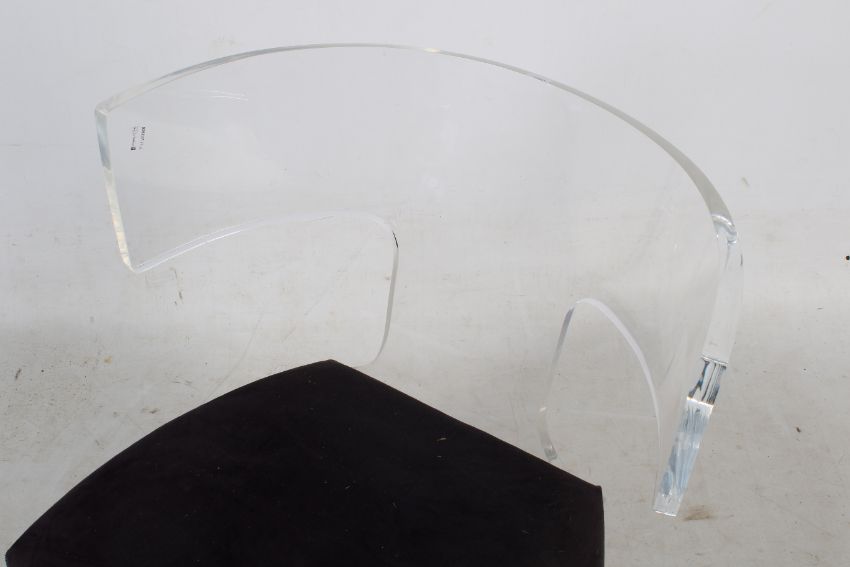 A 20th century chair constructed of clear plastic. Having a shaped backrest, upholstered in blue fabric, raised on tapered supports, H85cm