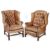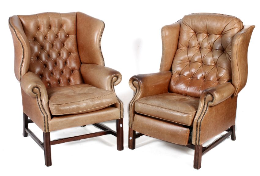 Two tan leather wing back armchairs. One having reclining action, with stud work detail raised on square wooden supports. Max. H110cm