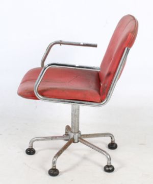 A Retro swivel chair. The seat and backrest upholstered in red leather, on a chrome frame with arm rests and four supports terminating in bun feet, H90cm