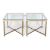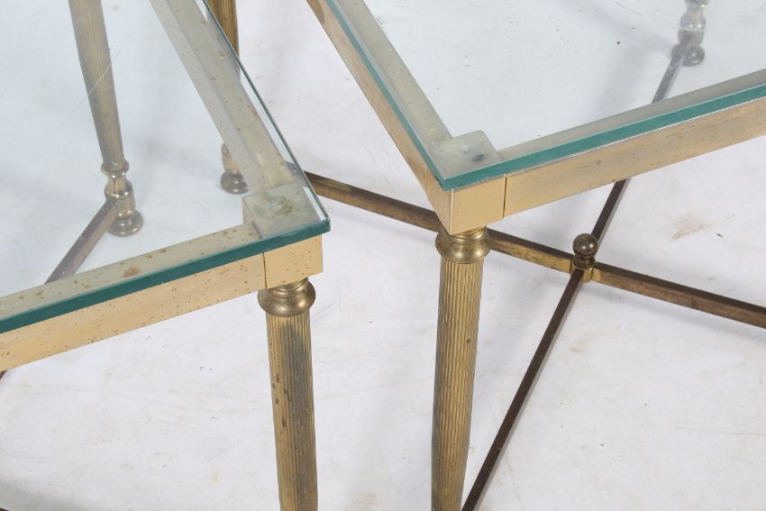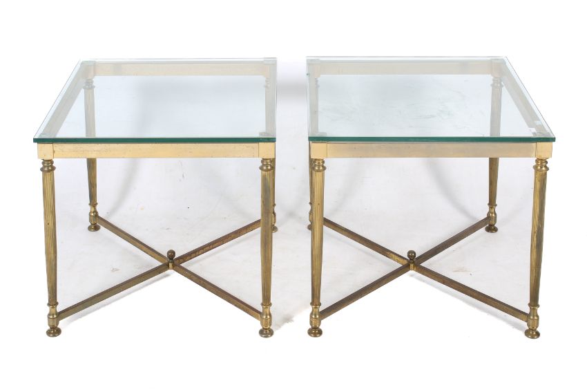A pair of 20th century glass topped side tables. The square tops mounted on cast metal brass effect frames, with ribbed tapered supports united by a 'x' stretcher, H54.5cm x W60cm x D60cm