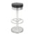 A retro bar stool. Having a circular black leather seat, attached to a chrome metal stand with a circular base, H82cm