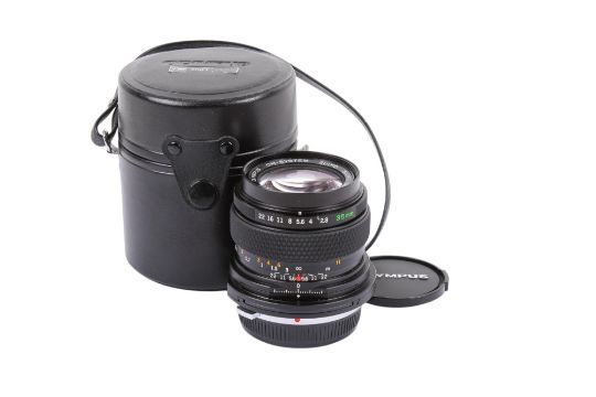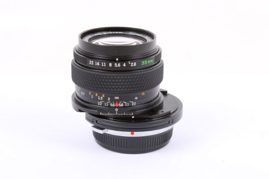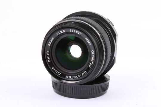 An Olympus OM 35mm f2.8 Zuiko Tilt Shift lens. Serial number 111837. With front and rear caps, and makers case. Optics E, functions well.
