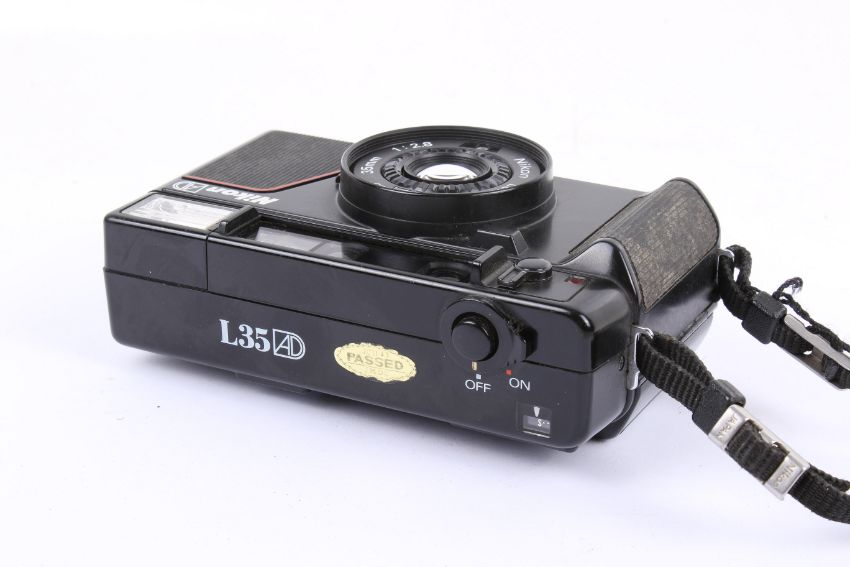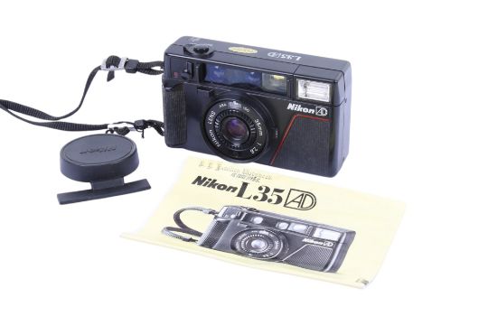 A Nikon L35 AD 35mm Compact camera. With a Nikon 35mm f2.8 lens, lens cap and instruction guide.