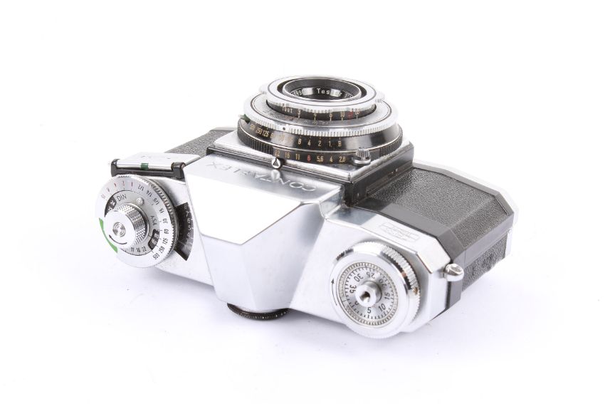 A Zeiss Ikon Contaflex 35mm SLR camera. Chrome. With a Carl Zeiss 45mm f2.8 Tessar lens and ERC. Shutter working and light meter responds to light.