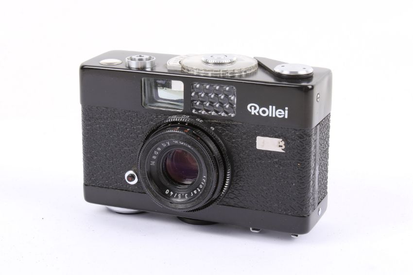 A Rollei Singapore B35 35mm compact viewfinder camera. Black. With a Rollei 40mm f3.5 Triotar lens, instruction manual and strap. Shutter working.