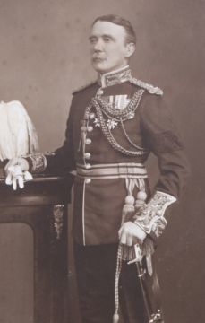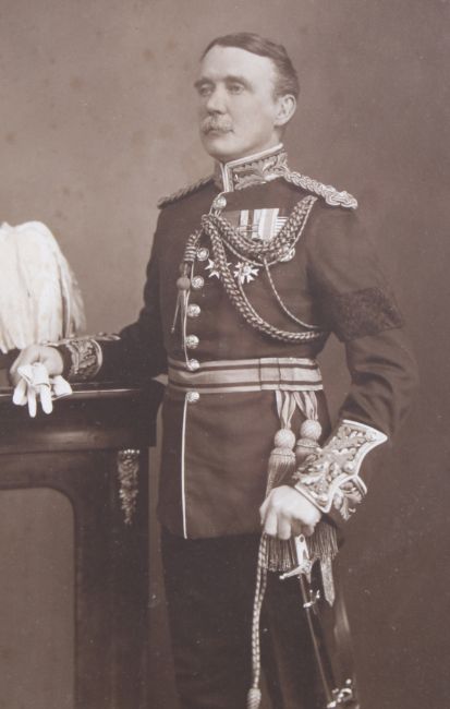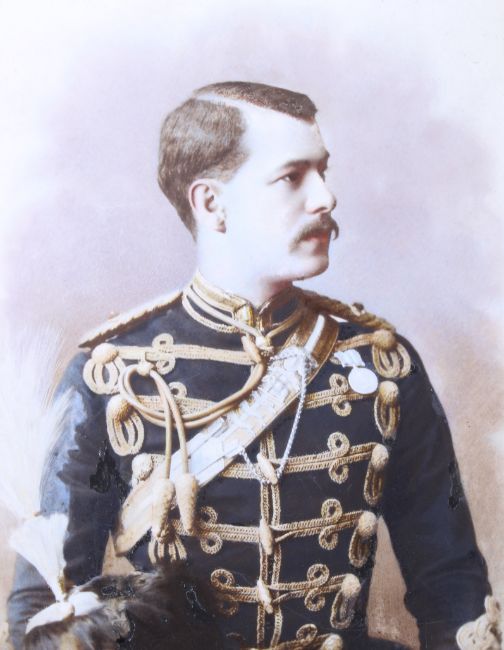 Two framed military portraits. Comprising a 19th century hand coloured carbon print military photograph on opaque glass. Of Lieutenant F.W. Clementson (1862-1889) from the 19th Hassans, 39cm x 29cm, and a carbon print example of Major General Sir Edward Sincalir May KCB of Rockbeare Court, Devon (Dublin 1856-Devon 1936), image size 28cm x 18cm, both framed and glazed.