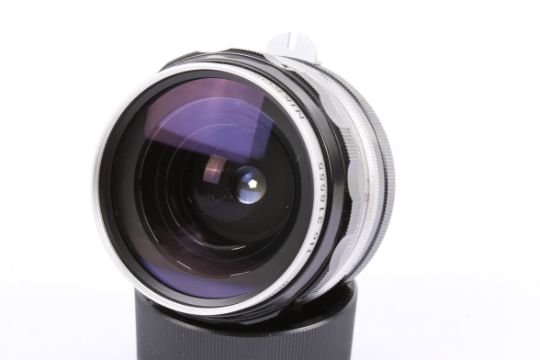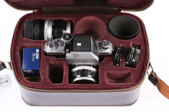A Nikon F Photomic T 35mm SLR camera outfit. Chrome. Serial number 6772455. With two lenses; a Nikkor-H Auto 28mm f3.5, and a Nikkor-Q Auto 135mm f3.5, four lenses caps, 135mm lens hood, instruction manual, brown leather Photomic ERC, and brown leather Nippon Kogaku outfit compendium case. Shutter working but sticking at slow speeds.