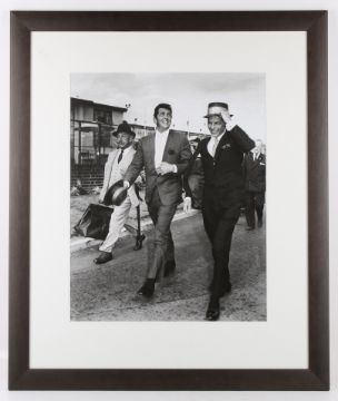 A black and white silver gelatin resin photograph of 'Frank Sinatra and Dean Martin'. Original photographer J. Wilds/Keystone Collection shot 4th July 1961. Depicting the singers arriving at London airport together with famed Beverly Hills restaurateur Mike Romanoff. In a Hulton Getty Picture Gallery blindstamped mount, acquired from the Conran Shop, label verso. Image size 47.5cm x 37cm, framed and glazed size 72cm x 61cm.