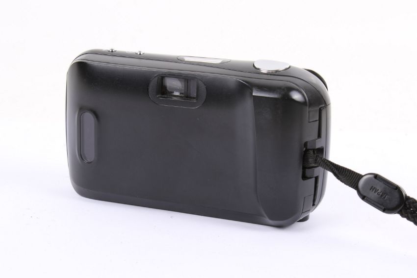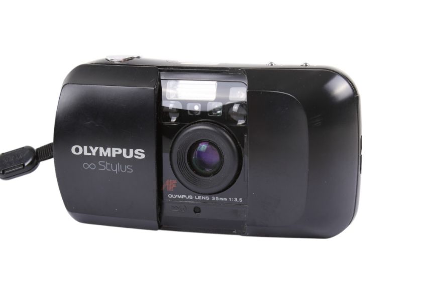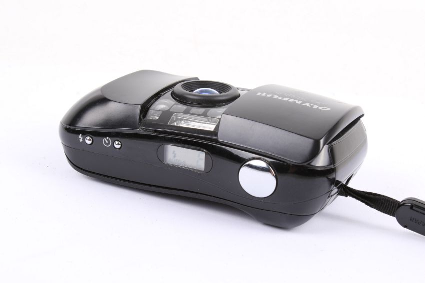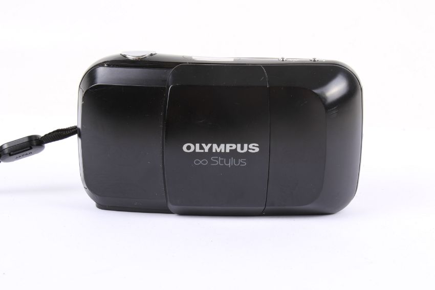 An Olympus Stylus 35mm compact camera. Black. With an Olympus 35mm f3.5 AF lens, and makers wrist strap. Powers on, shutter fires, and film rewinders as expected.