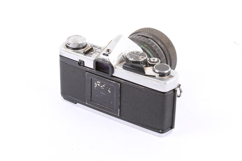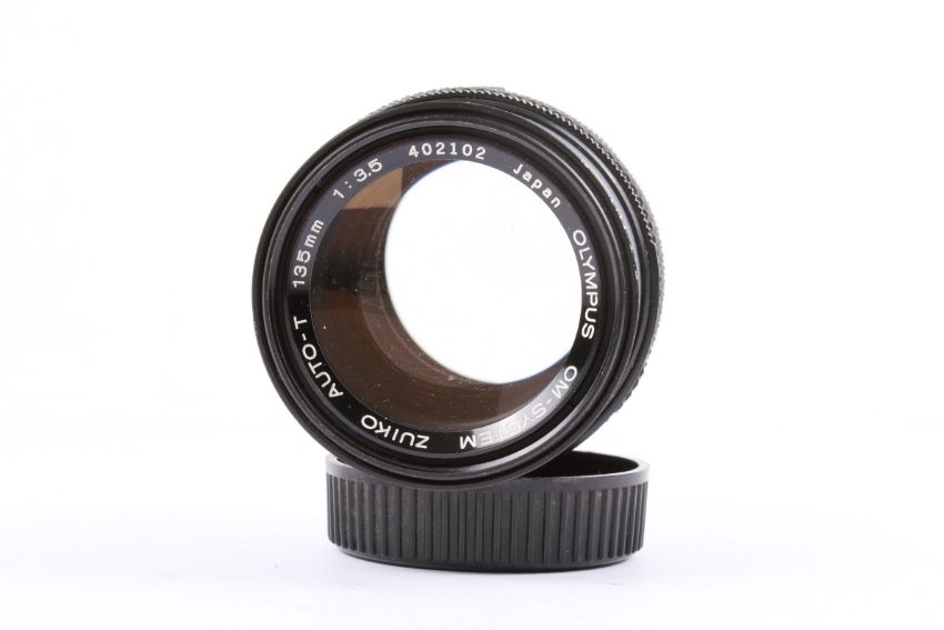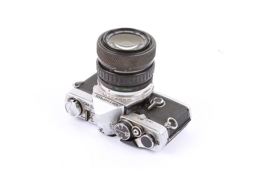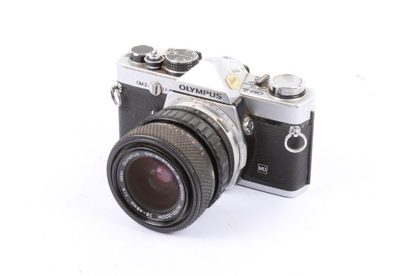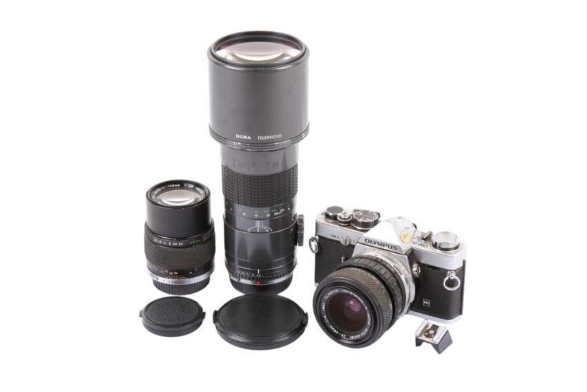 An Olympus OM-2n 35mm SLR camera outfit. With three lenses; an Olympus OM 28-48mm f4 S.Zuiko, an Olympus OM 135mm f3.5 Zuiko Auto T, and a Sigma Telephoto 400mm f5.6. Shutter not working.