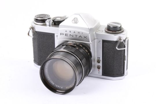 An Asahi Pentax S1a 35mm SLR camera outfit. with three lenses; an Asahi 55mm f2 Super-Takumar, a Rolmax 35mm f3.5, and a Pentacon 30mm f3.5. Together with a lens case and ERC. Shutter working but mirror stuck in up position - requires attention.