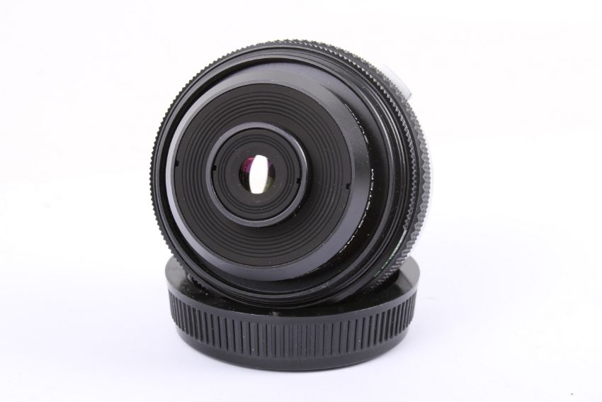 An Olympus OM 20mm f2 Zuiko Auto-Macro lens. Serial number 103716. With front and rear caps. Optics VG, functions well.
