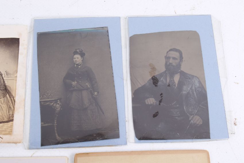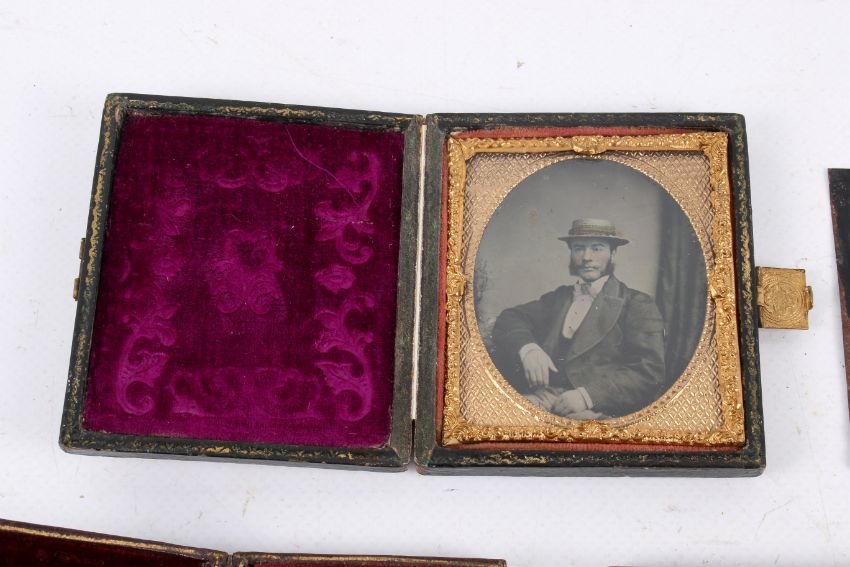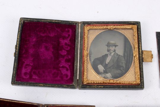 A small collection of Victorian photographic portraits. To include five cased Ambrotypes, two Cabinet Cards and more.