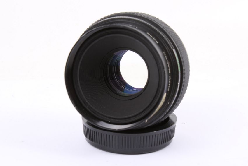 An Olympus OM 50mm f2 Zuiko Auto-Macro lens. Serial number 101578. With front and rear caps. Optics G/VG, functions well.