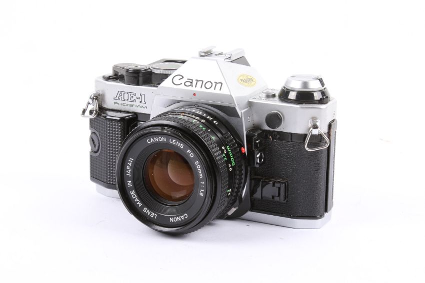 A Canon AE-1 Program 35mm SLR camera outfit. Chrome. Serial number 2770376. With three lenses; a Miranda 28mm f2.8 MC Macro, a Canon FD 50mm f1.8, and a Miranda 75-200mm f4.5-5.3 MC Macro. Together with a Canon ER case, a Canon shoulder bag, a Miranda 630 CD flash, and various accessories. Camera untested.