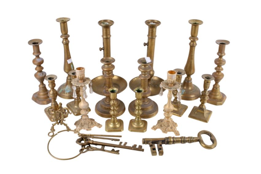 A collection of seven assorted 19th century and later pairs of brass candlesticks and some keys. Max. H31cm