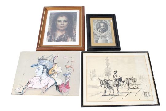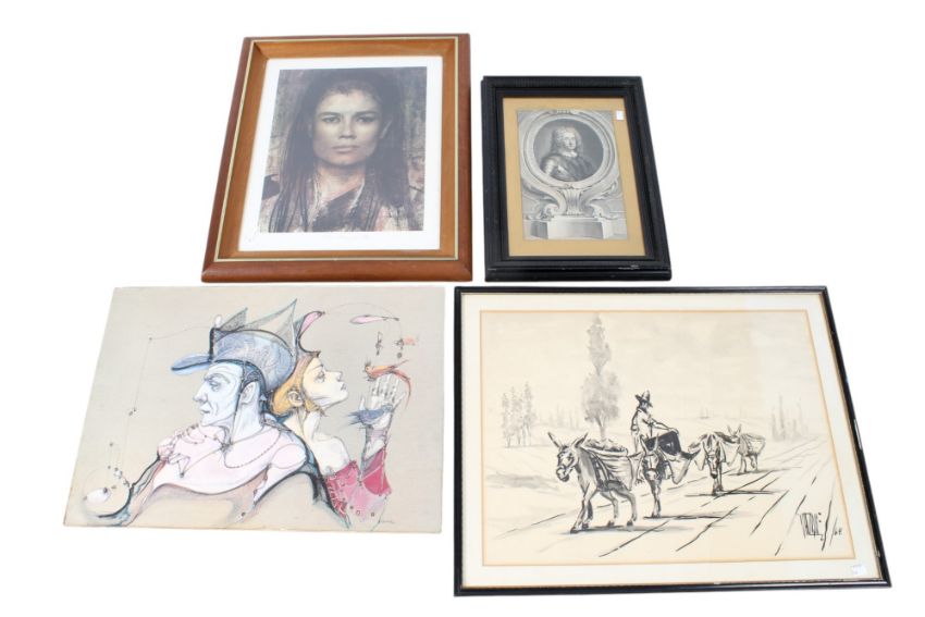 A group of four assorted prints. Including Mary Brilli (Italian postwar) contemporary print also with a brush and wash sketch of donkeys signed lower right and two other prints. Three framed and glazed, Max. 78cm x 60cm