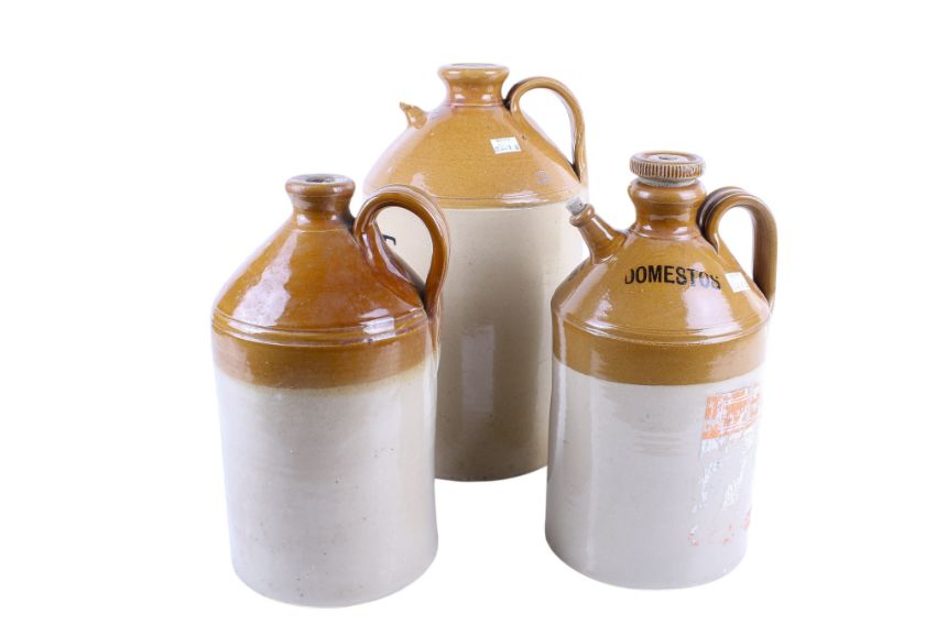 A group of three assorted stoneware chemical flagons. Including Parozone and Domestos, etc. Max. H40cm