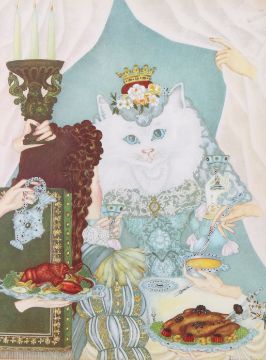 Adrienne Sequz (20th century) - 'Cat Queen', print, 23cm x 31cm, framed and glazed, 42cm x 52cm