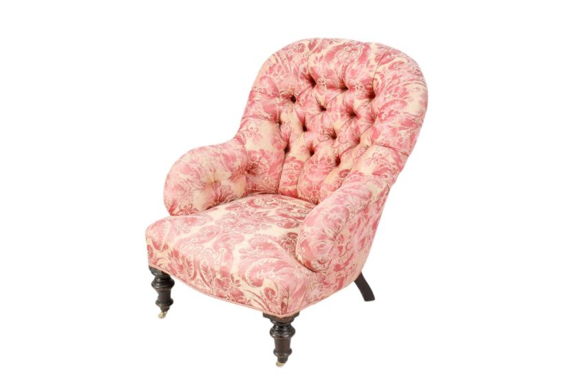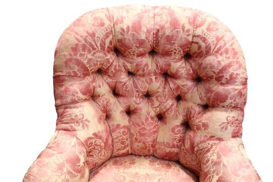 Minor wear to upholstery; one front caster missing; minor wear to legs.