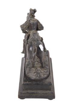 Appears in a fair condition for its age, reins have broken leaving screws and washers either side of the horse's mouth. one ear is bent over. The figure lifts slightly off the horse.