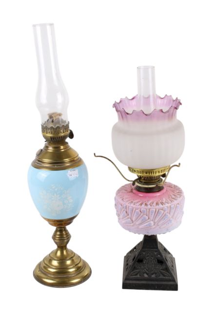 Two Victorian oil lamps. One having a pink glass reservoir with pierced metal base the other with a blue ceramic reservoir. Max. H64cm