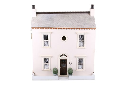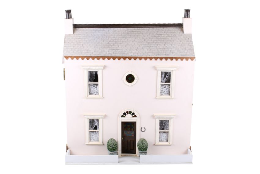 A 20th century doll's house and contents. Having a hinged front opening to reveal two up two down with electric lights. H67cm x W58cm x D40cm